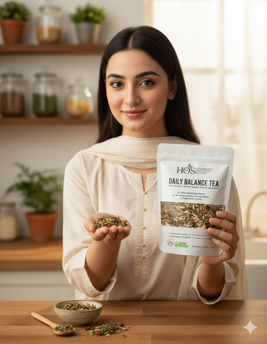 Daily Balance Tea is a gentle, 100% herbal tea carefully crafted for everyday use. Each cup is a blend of natural herbs and spices designed to support your body and mind in a natural, soothing way.