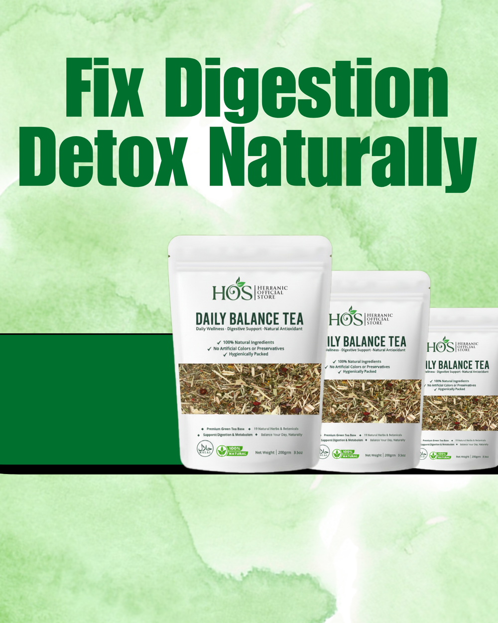 Daily Balance Tea is a 100% herbal blend made from natural ingredients like green tea, lemongrass, fennel, and more. It is designed to support digestion, refresh the body, and help you feel balanced every day.